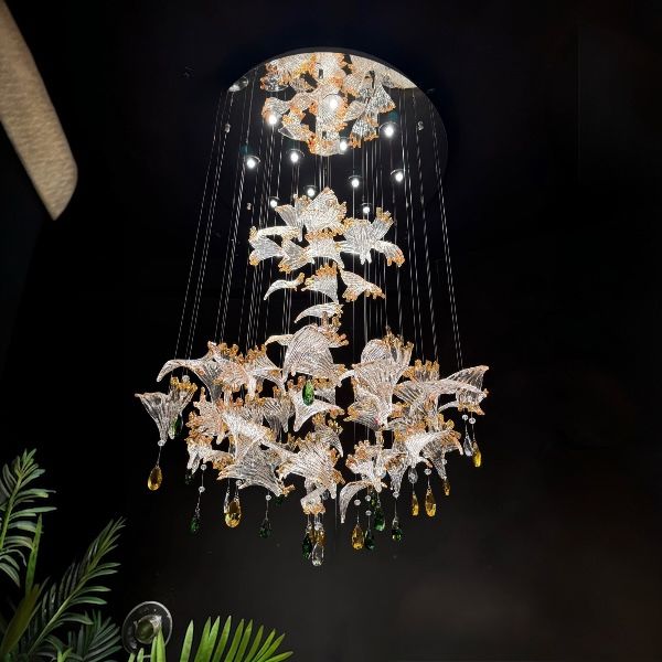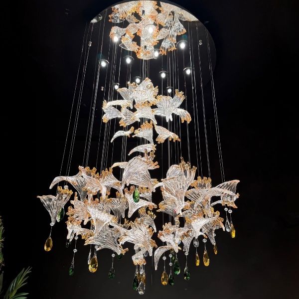Add a statement of elegance to your interior with this luxurious designer crystal glass chandelier. Crafted with beautifully shaped amber and clear dual-color glass leaves, this chandelier creates a stunning visual effect while reflecting light in a mesmerizing way.