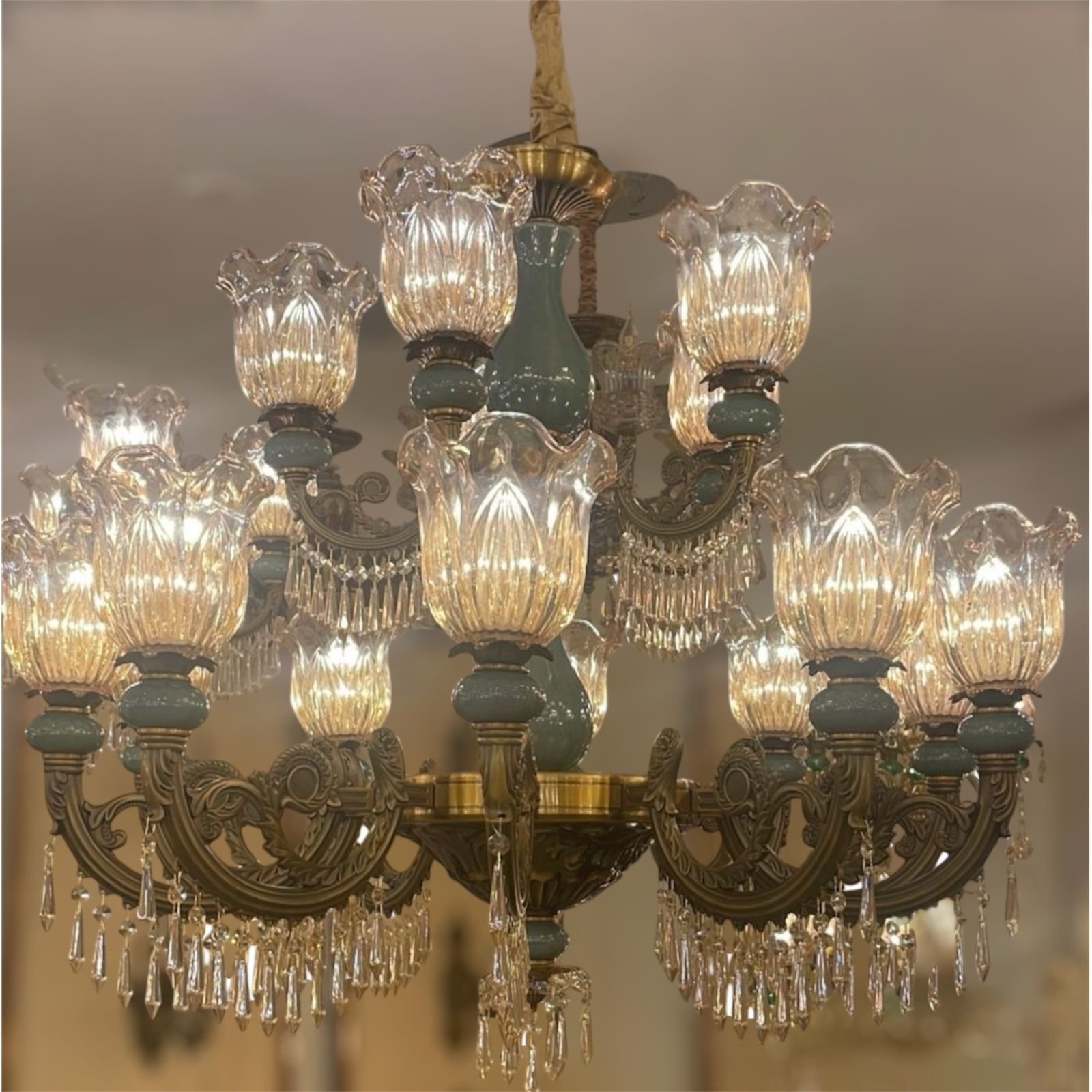 Add timeless elegance to your interiors with this 12-arm premium antique chandelier, featuring ornate brass arms, crystal drops, and vintage glass shades. Ideal for grand living spaces and traditional interiors.