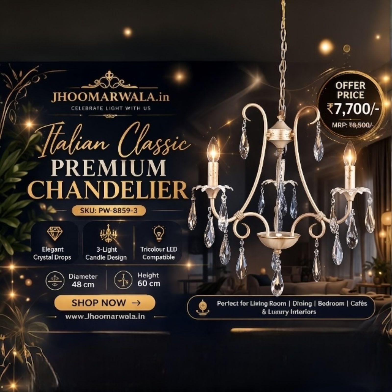 The candle-style lights give a vintage royal feel, while the Premium painted metal finish adds warmth and luxury to your décor. Ideal for living rooms, bedrooms, dining areas, cafés, and boutique interiors, this chandelier creates a welcoming and stylish ambiance.