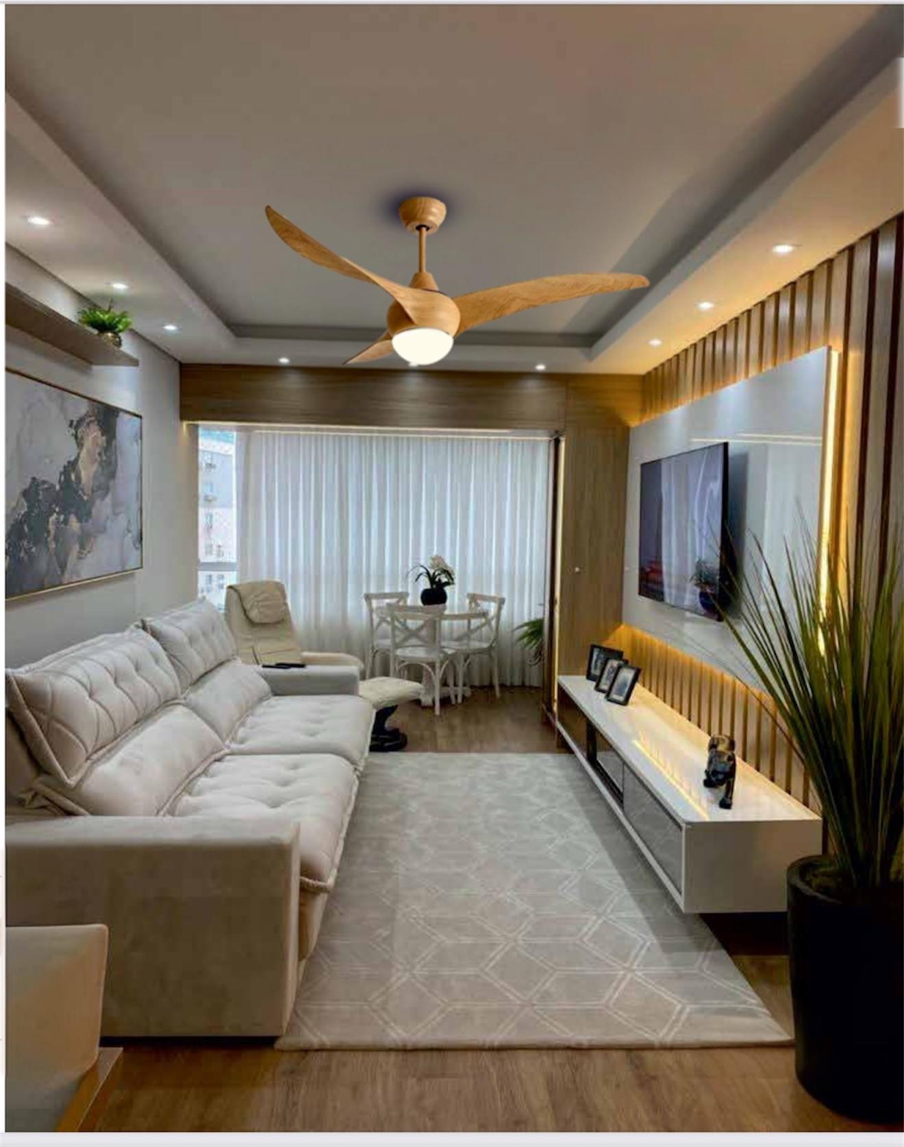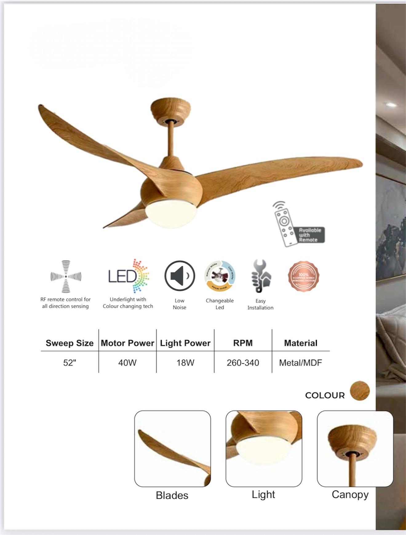 – Elegant 3-blade design with a natural wood texture for a luxurious interior look.