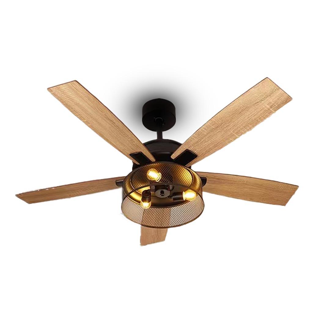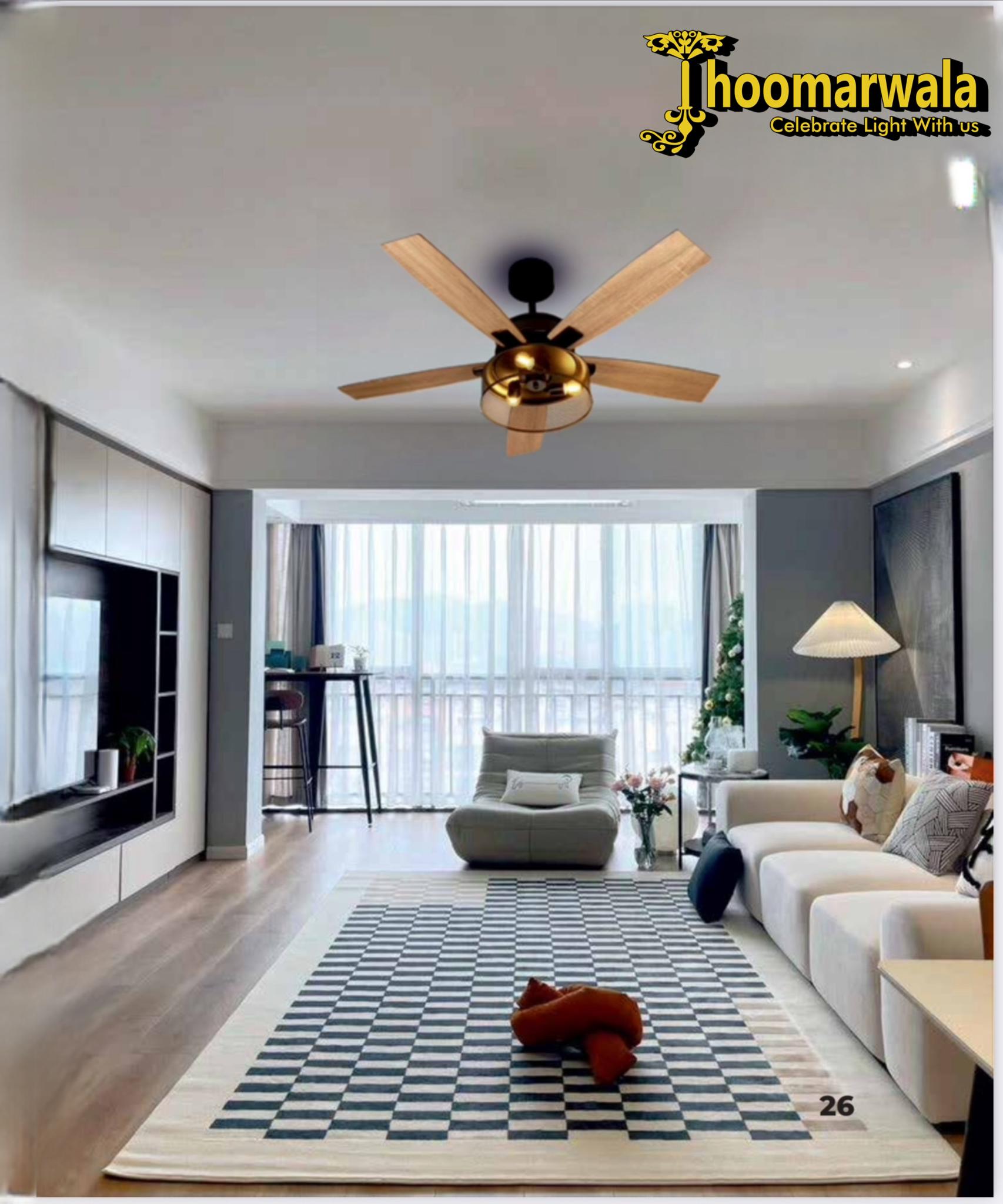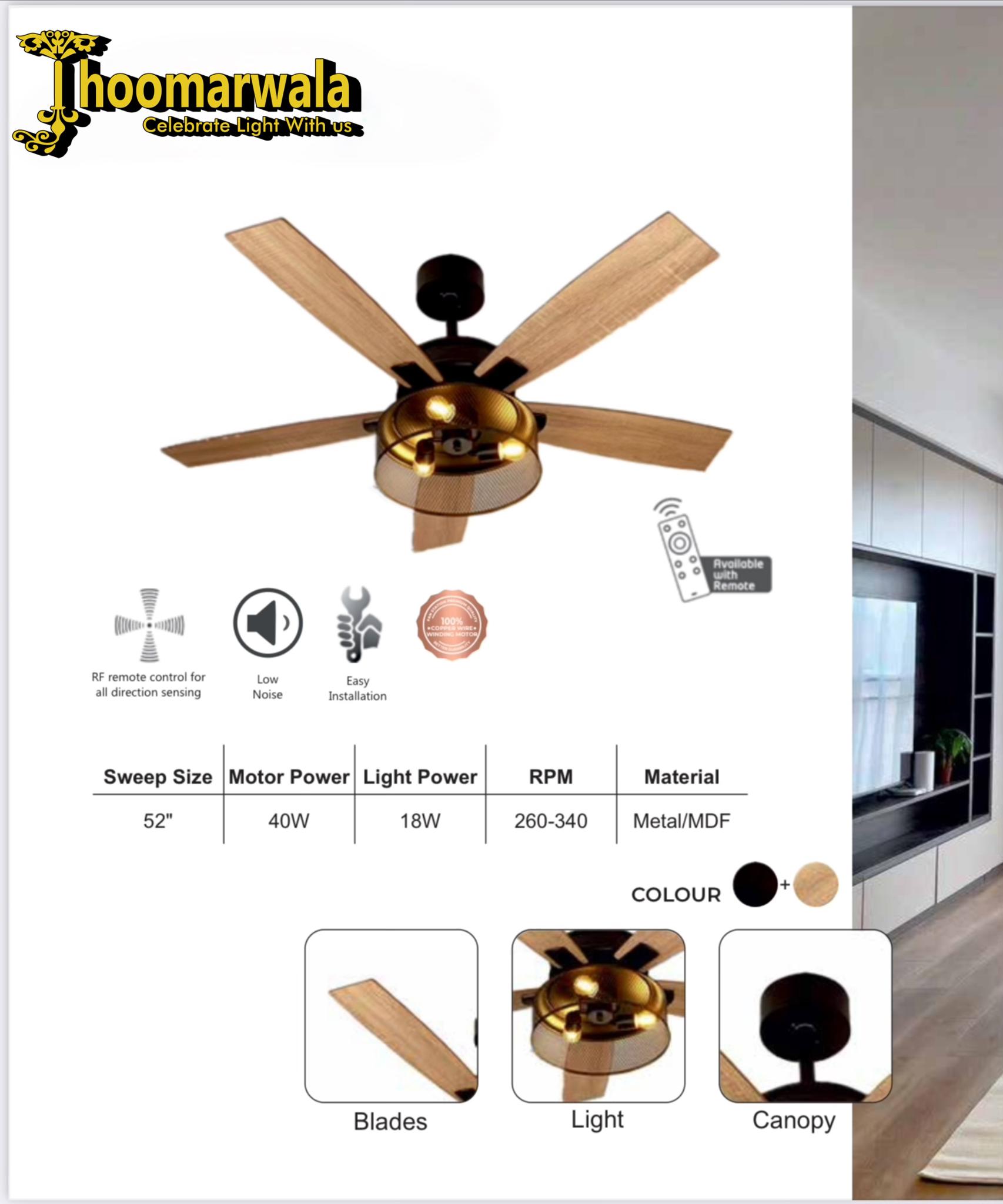 • Design: Wooden finish blades, golden light grill, elegant black canopy