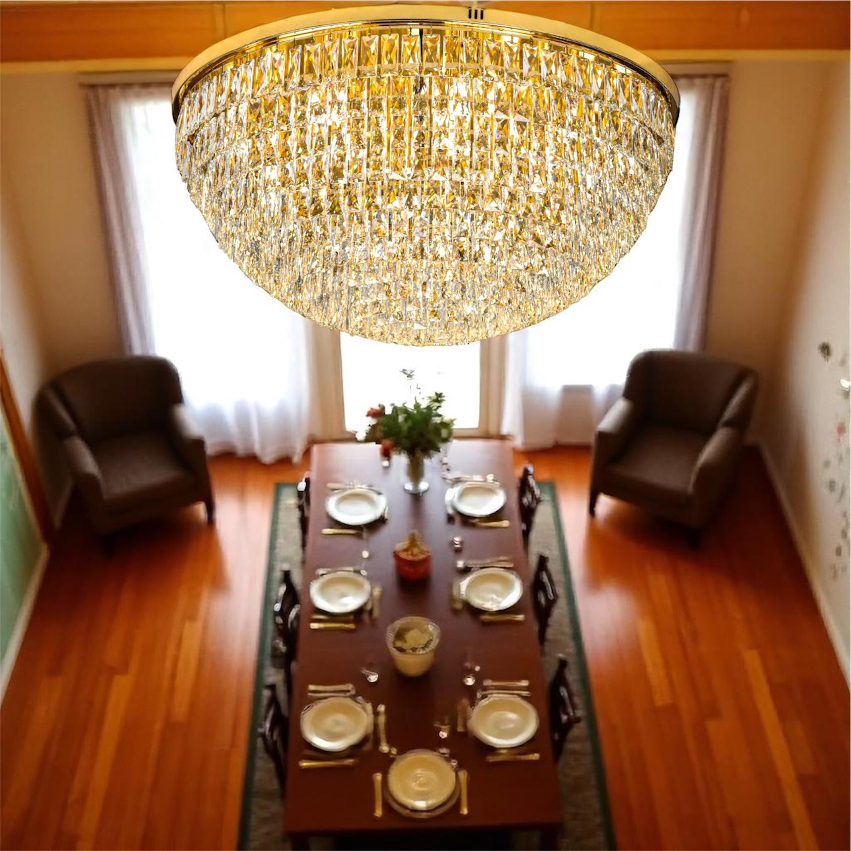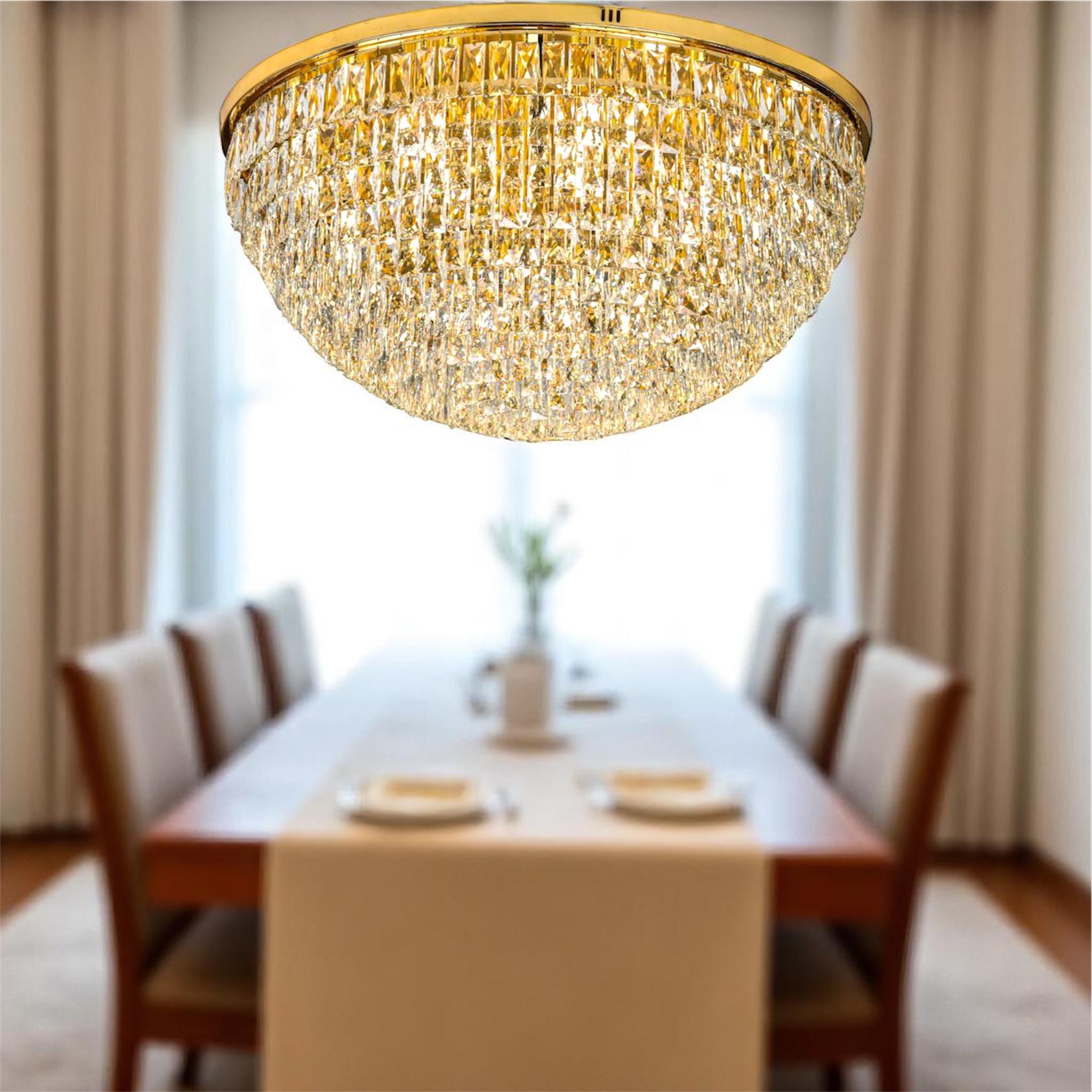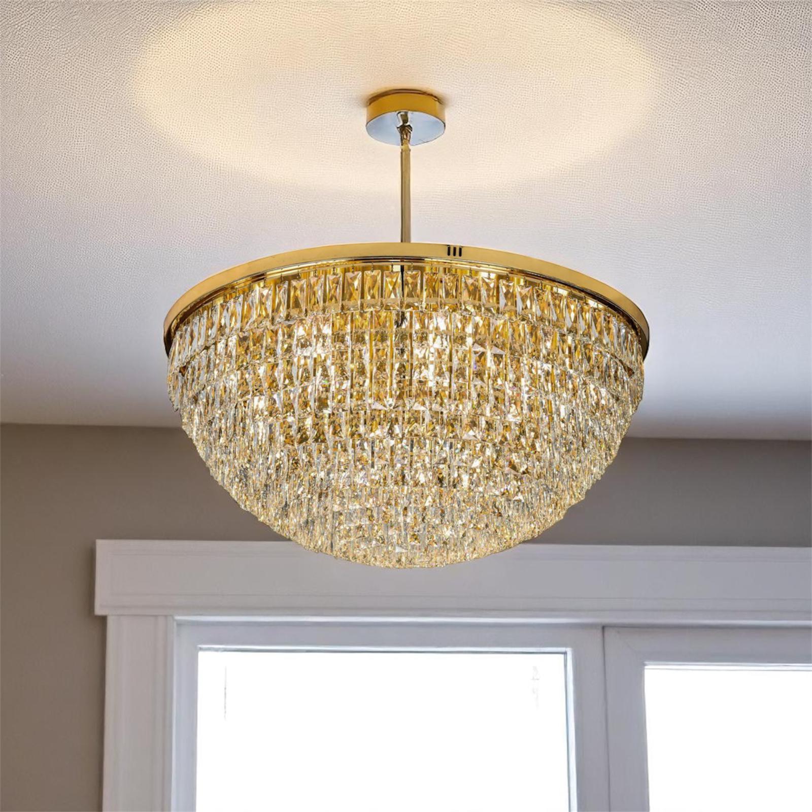 A Majestic Flush-mount Crystal Chandelier Crafted With K9 Sparkling Crystals And A Rich Golden Finish.
