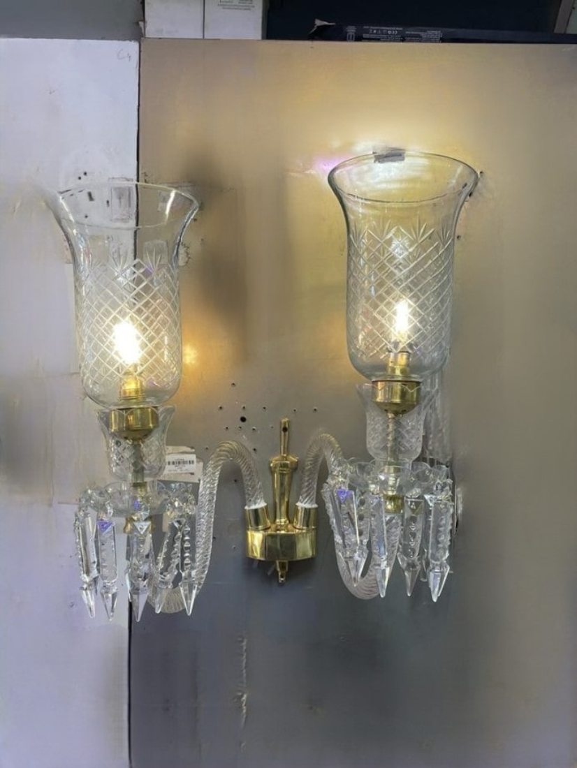 The Simple But Fashionable LED Wall Lights Design Conform To The Ultimate Pursuit Of Modern People a vintage-inspired wall light with candle-style illumination, designed to evoke the grandeur of a Maharaja Palace while reflecting the refined elegance of Italian classical sconces. The fixture features two glass chimneys with intricate etched patterns, each mounted atop ornate crystal arms and finished with brass hardware