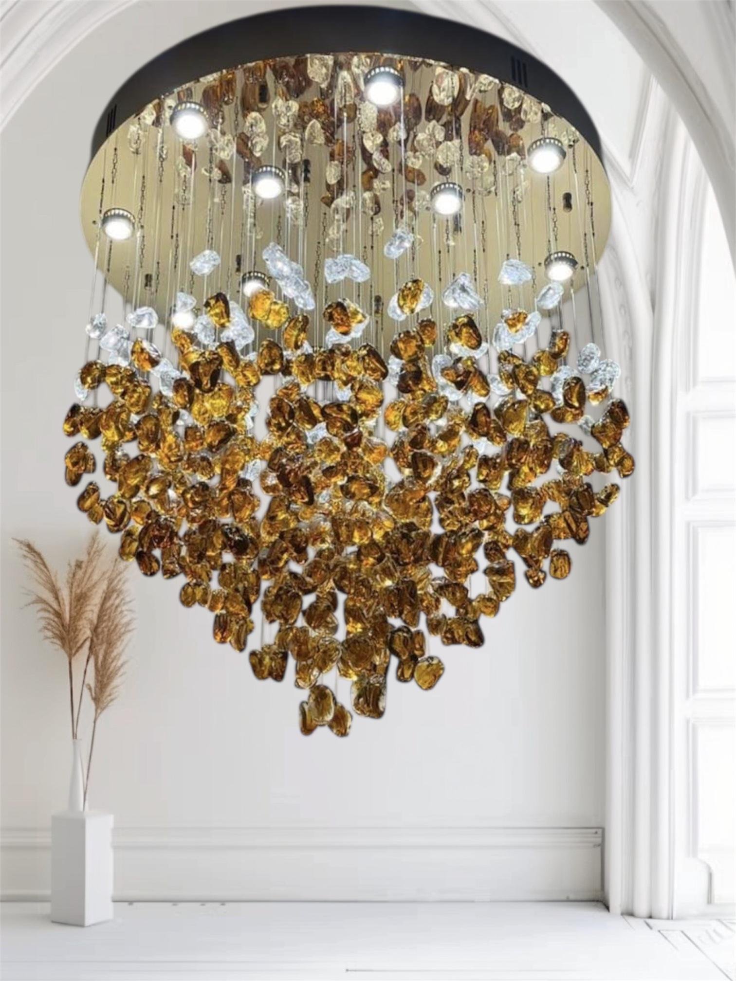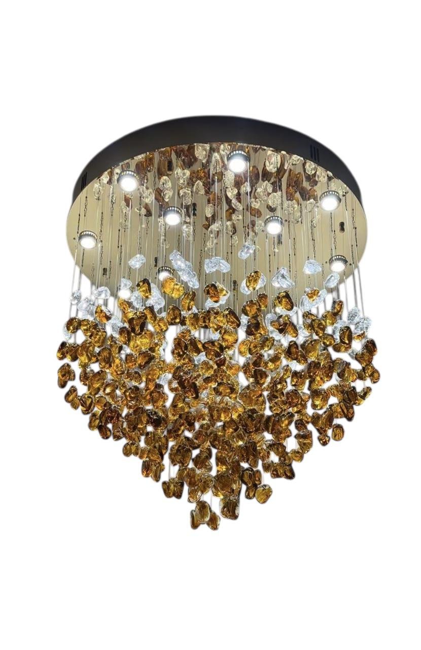 Add a touch of nature-inspired opulence to your interiors with this luxurious ceiling-mounted chandelier featuring 580 tea & clear crystal stones. The earthy amber tone of the stones combined with precision-cut clear pieces creates a dramatic, floating crystal garden effect.Perfect for dining areas, entry foyers, and bedrooms, this 600mm x 800mm piece showcases modern design with organic form – suspended from a sleek metallic base with warm LED lighting.