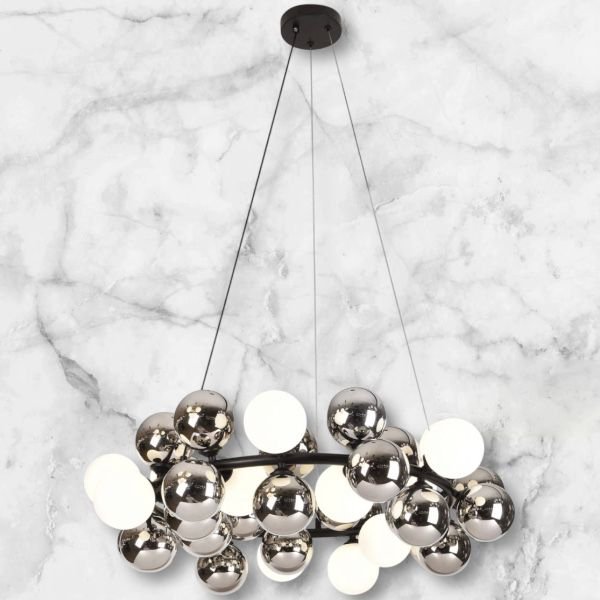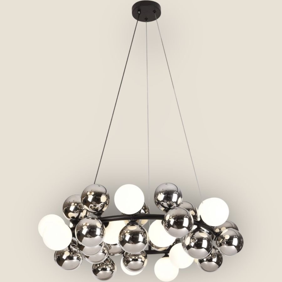 This modern designer chandelier blends sophistication and innovation through its stunning combination of chrome-finished glass and white milky glass globes arranged around a metal circular frame. Measuring 80 cm in diameter with a height adjustable up to 5 feet, this chandelier offers flexibility for different ceiling heights and décor settings.