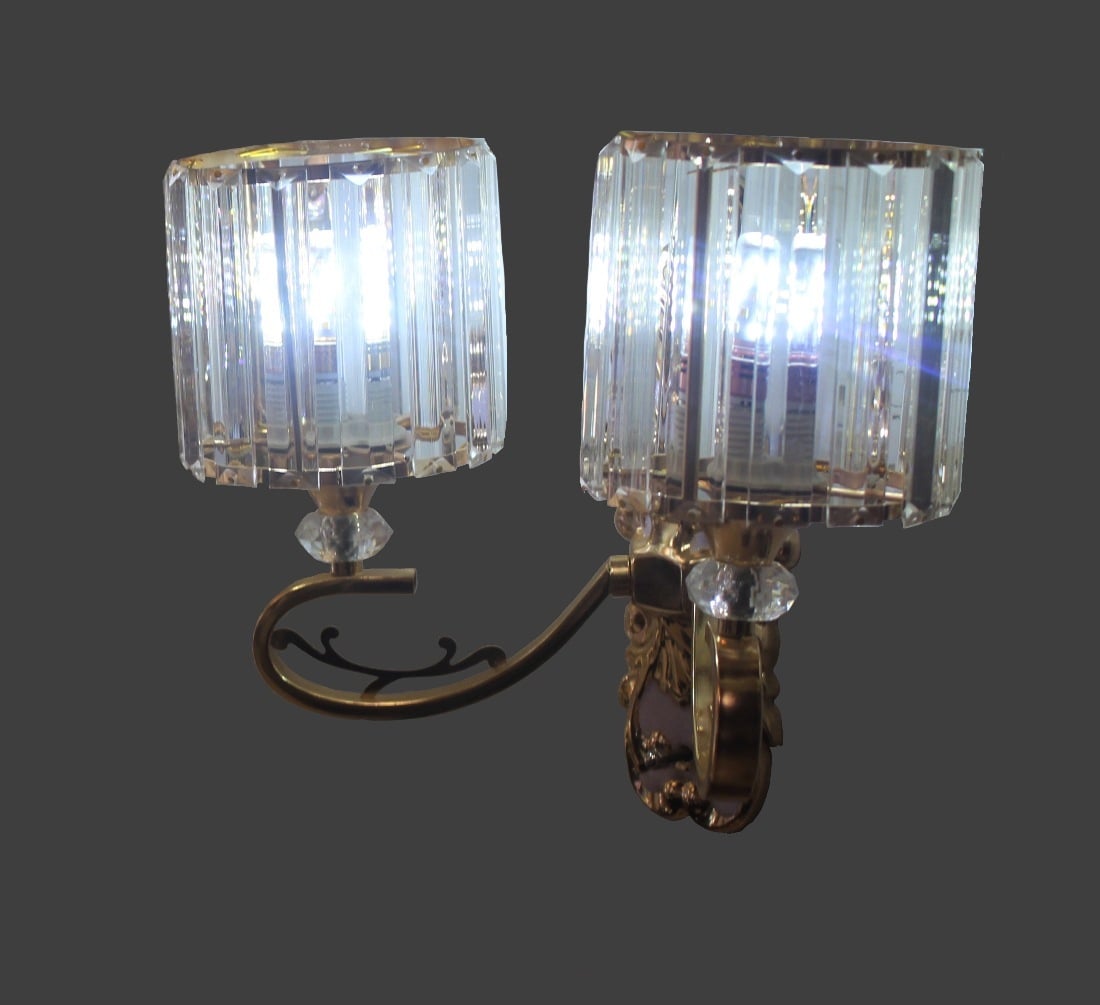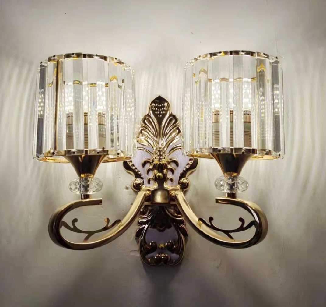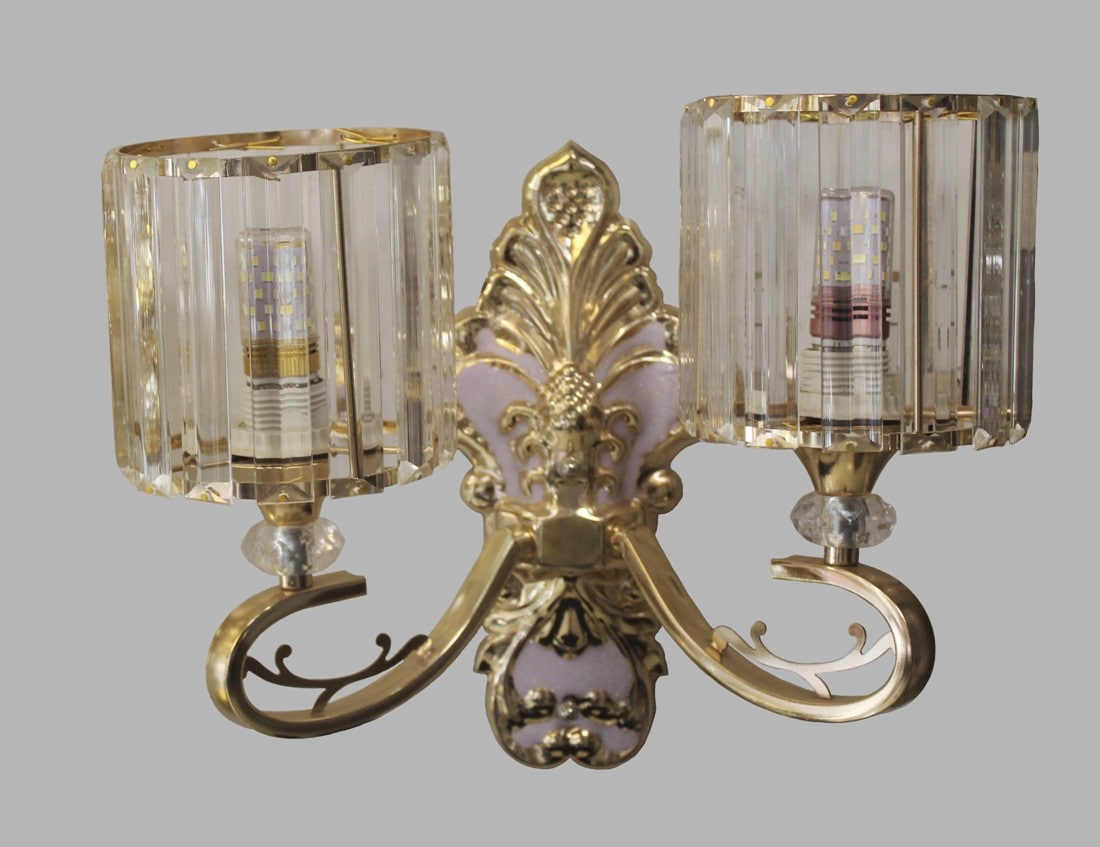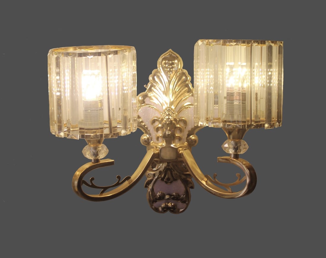 Golden Finish And Shiny Clear Crystal Decor Two Lamp Shade Wall Sconce Lamp With Carved Arm