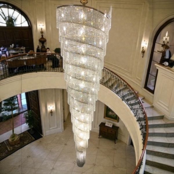 This luxurious spiral crystal chandelier showcases breathtaking elegance and craftsmanship. Measuring an impressive 365 cm (12 feet) in height with a 3-foot diameter, it is designed to make a bold statement in large, high-ceiling spaces.