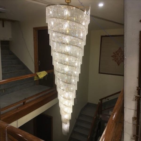 Magnificent grand spiral chandelier crafted with golden standard steel and premium K9 white crystals. A luxurious centerpiece ideal for living rooms, hotel lobbies, and banquet halls. https://jhoomerwala.wordpress.com/2021/10/26/our-new-project-in-jammu-kashmir-completed/