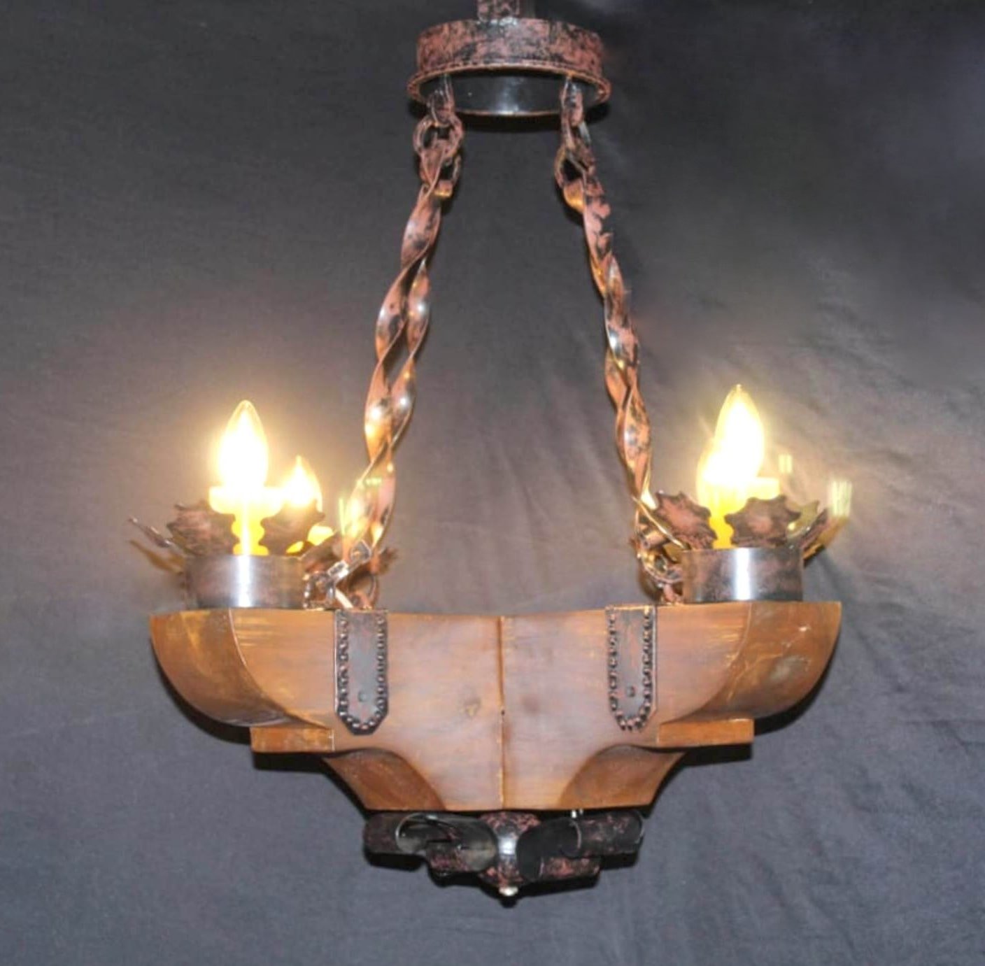 Add a warm, nostalgic charm to your interior with this wooden and antique metal chandelier, a perfect blend of rustic craftsmanship and classic elegance. This hanging light features a beautifully carved wooden base paired with twisted metal chains in a distressed antique finish. The upward-facing candle-style bulbs recreate a soft, vintage glow, making it an ideal statement piece for any room.