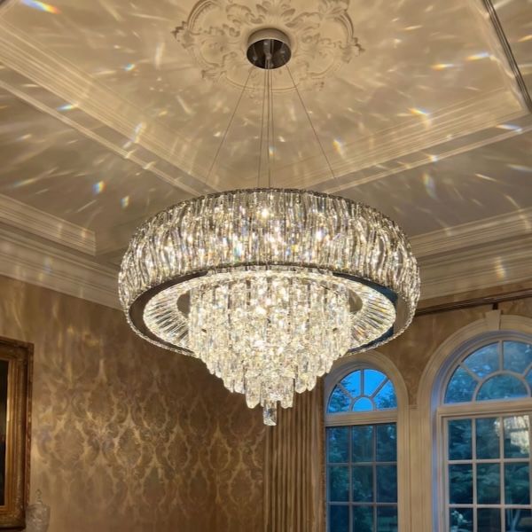 Elegant designer crystal chandelier featuring sparkling premium crystals arranged in a circular modern frame. Perfect for dining rooms, living rooms, hotels, and luxury interiors.