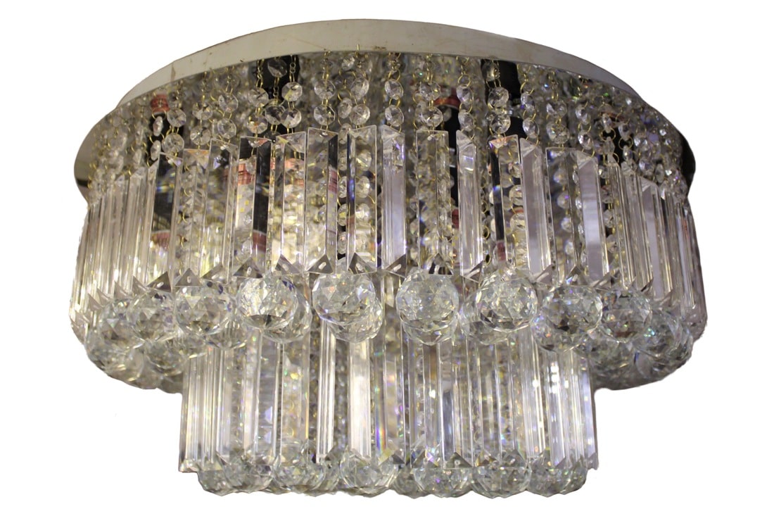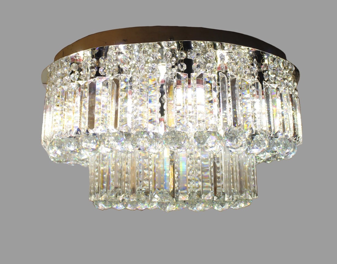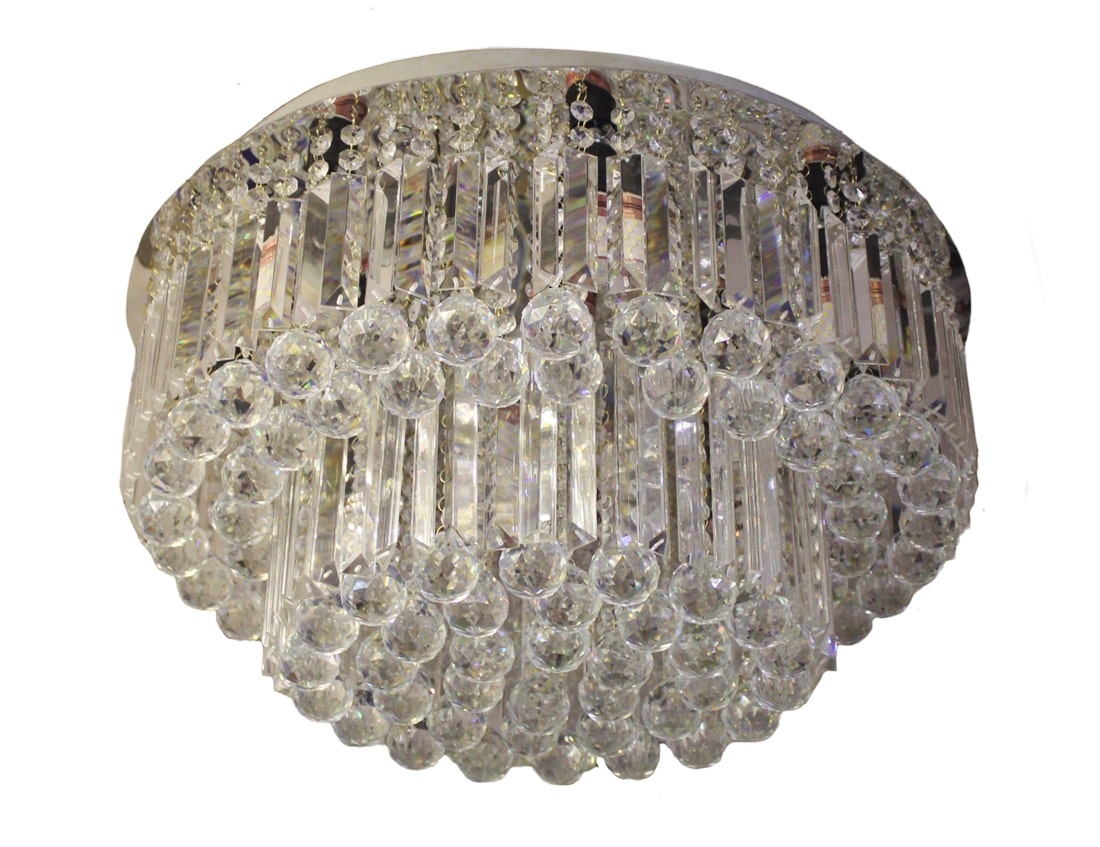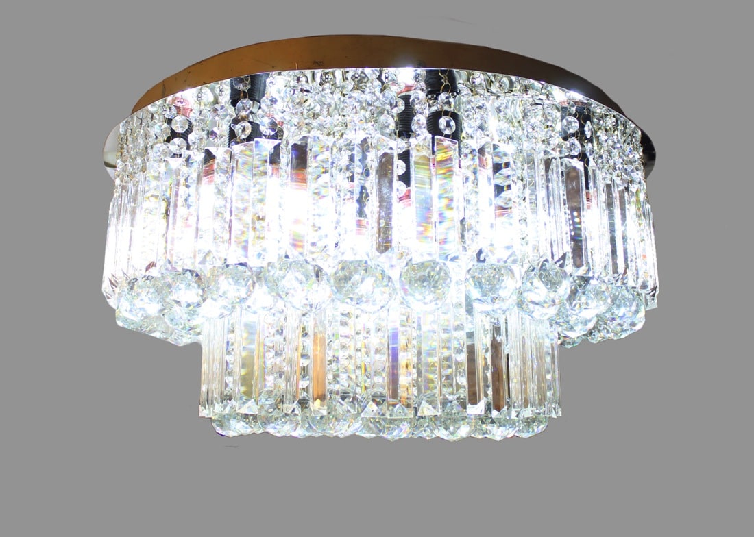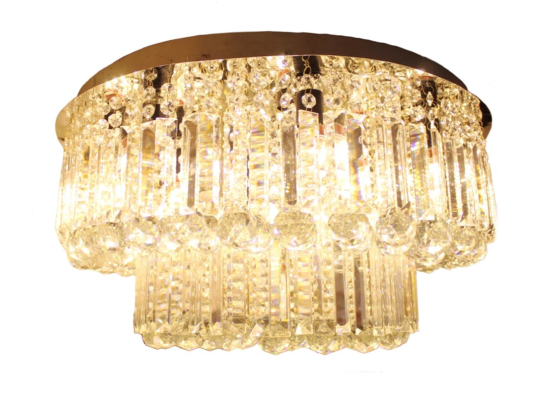 These chandelier are truly necessary have to decorate all kind of rooms and choice able place.This round flush-mount chandelier features Two tiers of K9 crystal and patri glass pieces arranged in a compact rectangle shape Crystal that sits close to the ceiling. The design creates a dense waterfall of crystal, giving rich sparkle without occupying too much vertical height, which is perfect for low to mid-height ceilings in bedrooms, dining areas and hotel corridors.