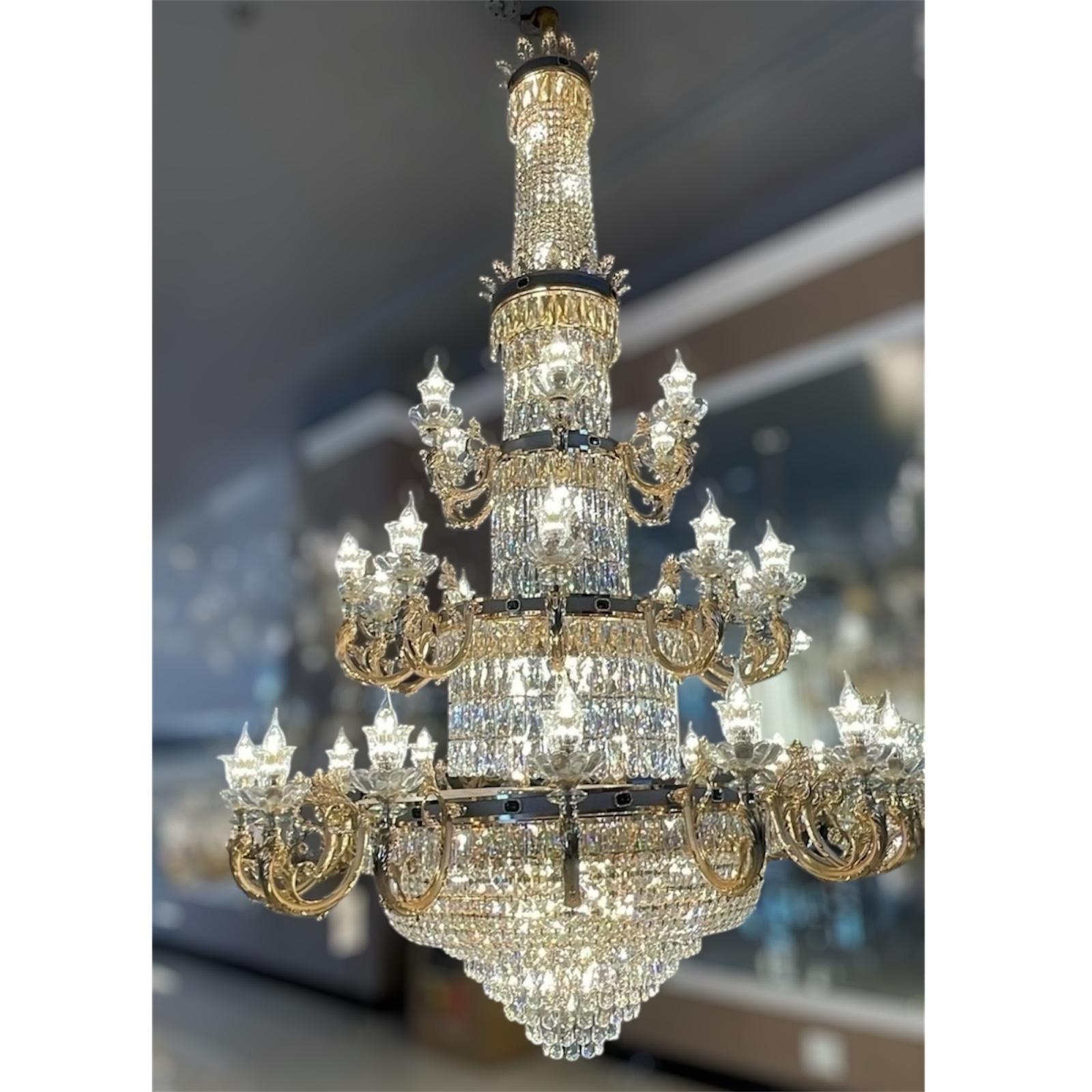 Add a touch of timeless grandeur to your interiors with this Luxury Grand Royal Crystal Chandelier from Jhoomarwala.in. Crafted for opulent spaces, this chandelier boasts a massive 150cm diameter and 240cm height, featuring multi-tiered design elements with hand-polished crystals and regal golden-finished 31 arms.