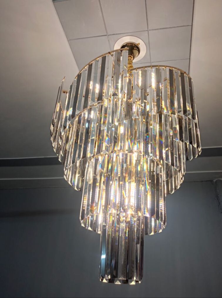 Upgrade your interior with this stunning modern spiral-tier crystal chandelier from Jhoomarwala, designed to deliver timeless elegance and luxurious ambiance. Crafted with high-quality K9 crystals and gold-finish metal, this chandelier reflects light beautifully, adding a sparkle to living rooms, staircases, lobbies, or dining areas.