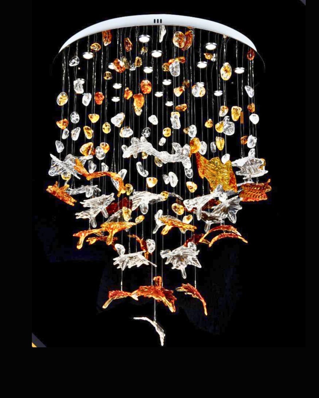 This chandelier features a striking modern design, ideal for resort lobbies, contemporary garden spaces, and upscale hospitality venues. The fixture showcases a circular canopy with suspended elements that resemble delicate flowers and abstract organic shapes, crafted in vibrant hues of gold, orange, and clear crystal-like finishes. These components are thoughtfully arranged on fine wires to create a cascading effect that evokes movement and elegance