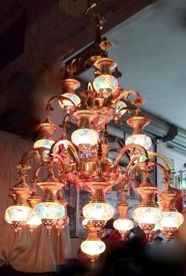 Moroccan Glass Shade Antique Brass Finish Double Height Chandelier