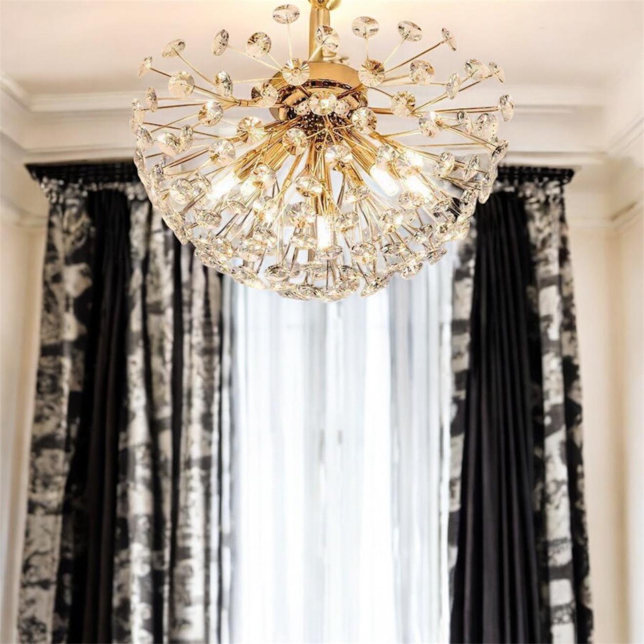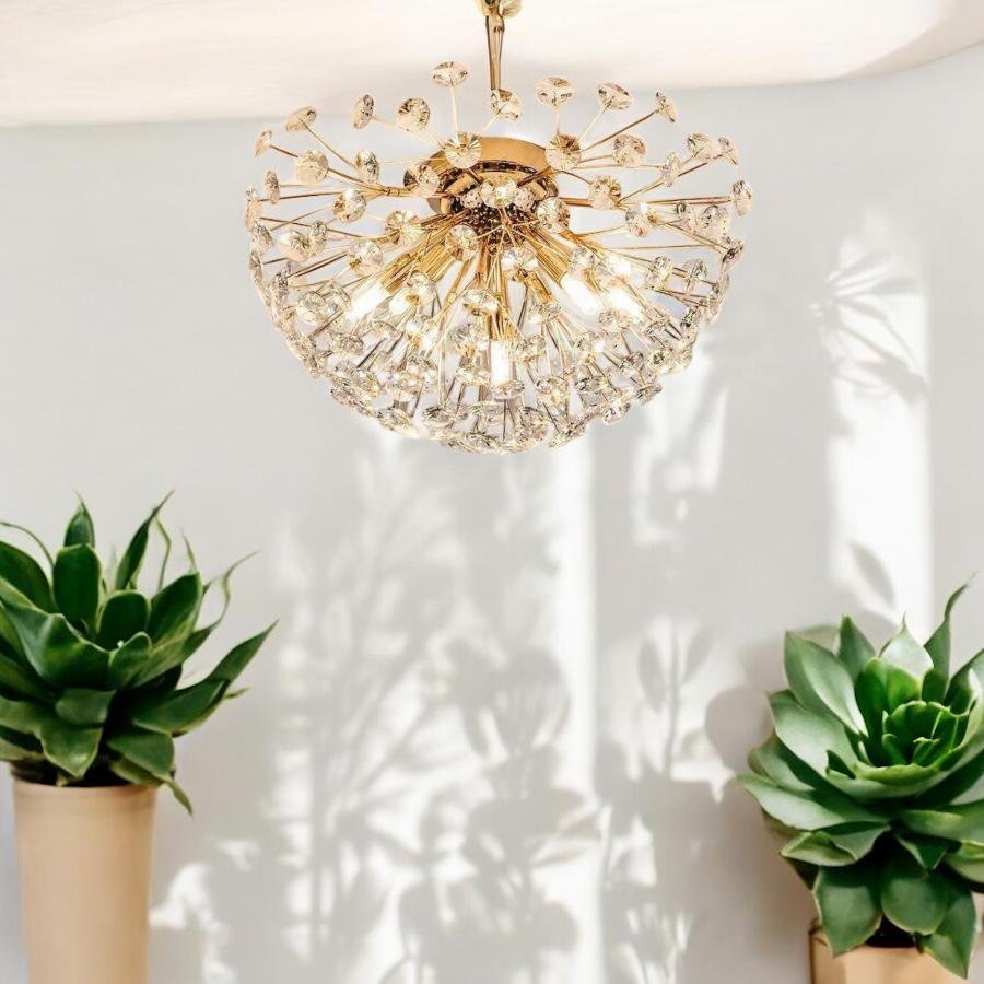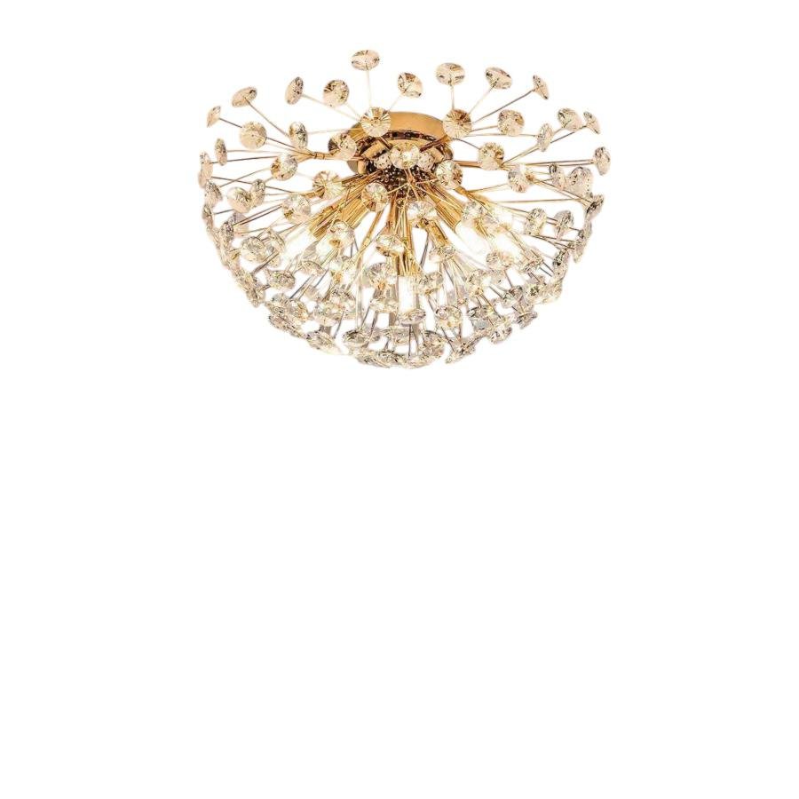 Designed with a gold-plated finish and G9 light holders, this 350mm ceiling fixture features dozens of dazzling K9 cut crystals that scatter light like a galaxy of stars.Perfect for compact spaces like bedrooms, corridors, bathrooms, or apartment living rooms, this semi-flush mount light is a modern alternative to bulky chandeliers, delivering luxury without taking up too much vertical space.