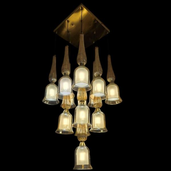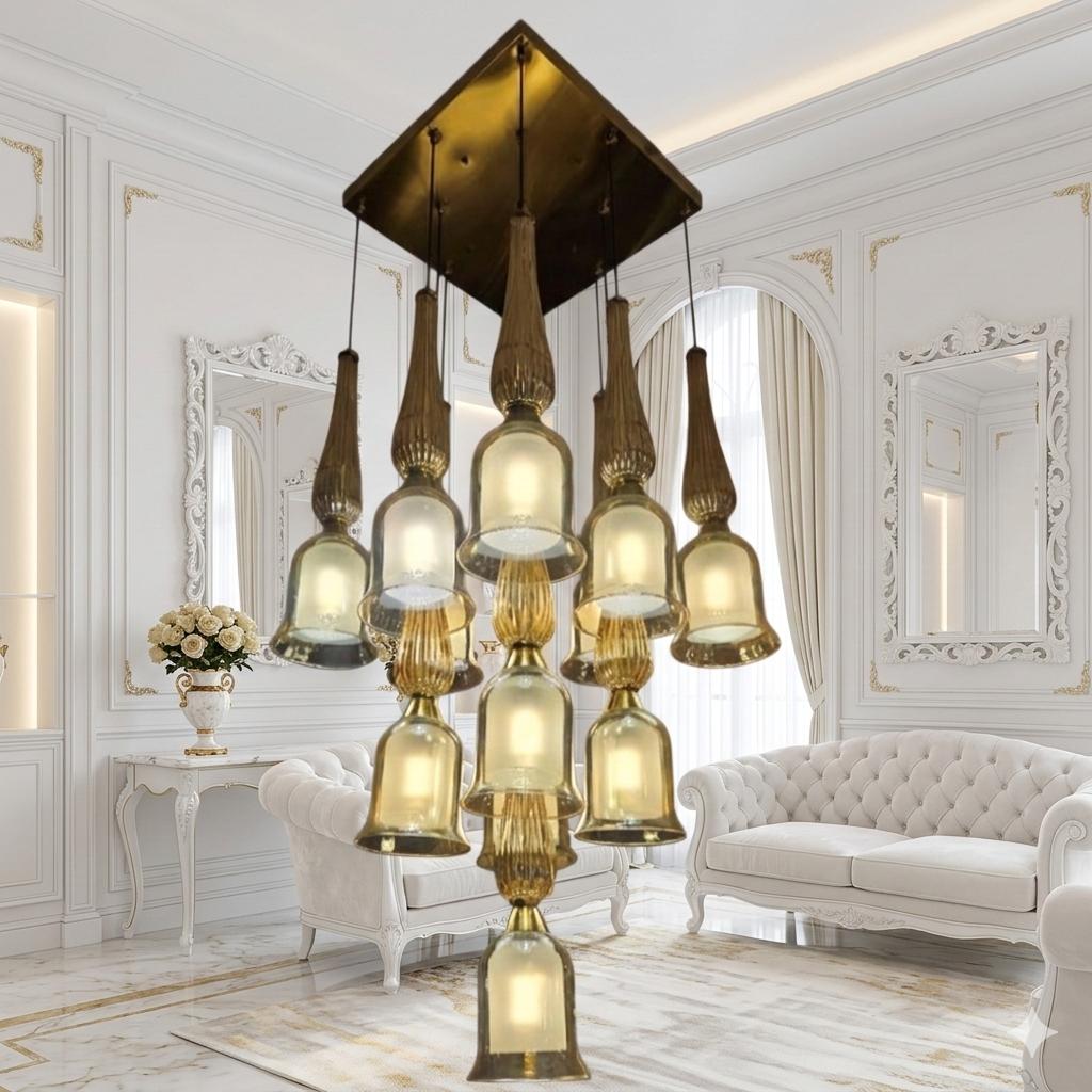 A masterpiece of illumination, this Designer Glass Chandelier blends regal elegance with modern versatility. Featuring a striking tiered bell design and a customisable Tricolour LED system, it is the perfect centerpiece for grand living rooms, stairwells, or foyers.