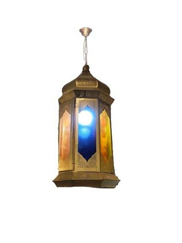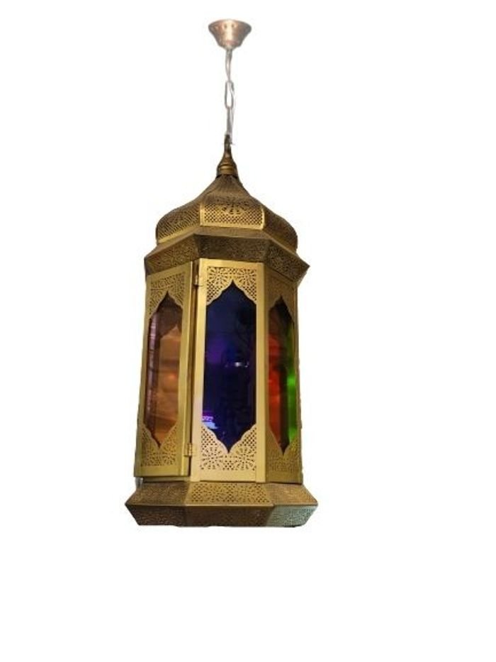 Elegant handcrafted brass hanging lantern with multi-color glass panels, perfect for creating a warm, vintage ambiance in living rooms, hallways, or outdoor patios. Its traditional design blends art and craftsmanship beautifully.