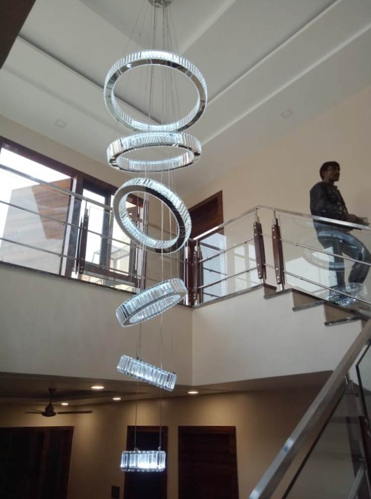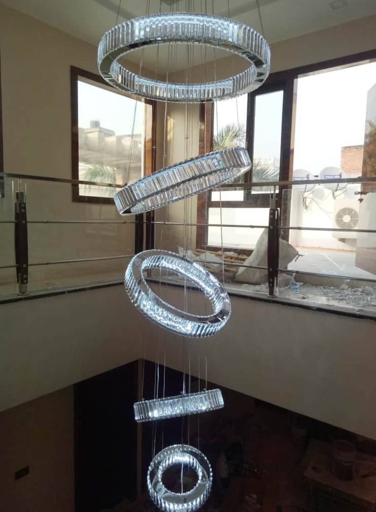 The Different Size Crystal Decor Ring Pendant Chandelier With Three Colours Changing Led Light For Stair Case And Double Height Ceiling Home And Hotel