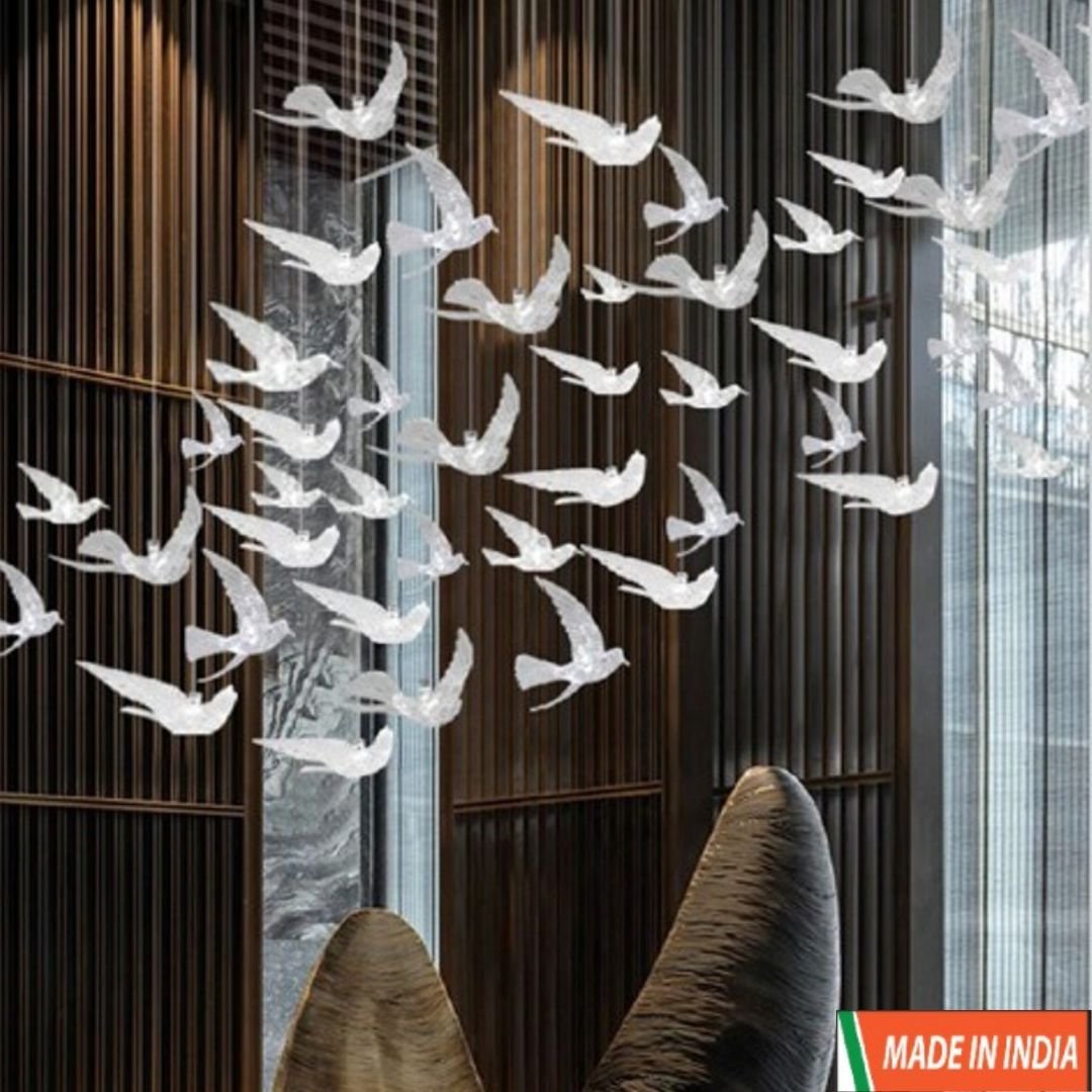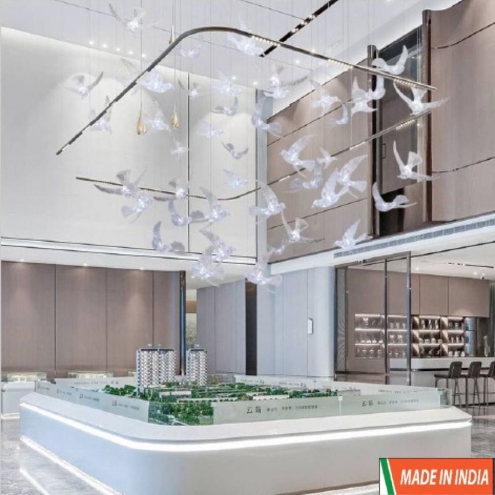 The Fly Bird chandelier masterfully blends artistic sculpture with functional lighting. Each bird is crafted from transparent glass, which reflects and diffuses light beautifully, contributing to a luxurious yet airy atmosphere. The minimalistic metal frame ensures a seamless, modern aesthetic that enhances the dynamic sense of movement within the installation.