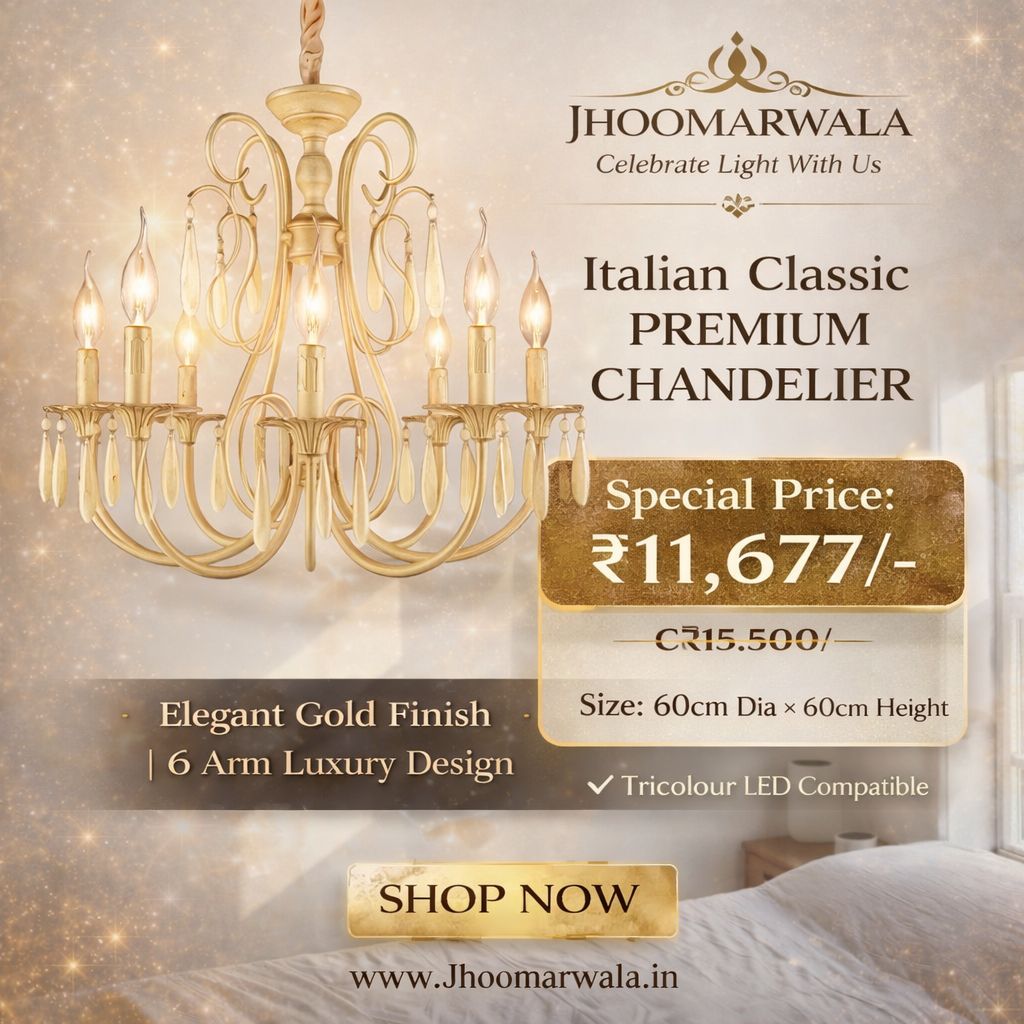 This Italian classic gold chandelier featuring 6 beautifully crafted arms, premium metal finish, and warm tricolour LED lighting—perfect for living rooms, bedrooms, and luxury spaces.